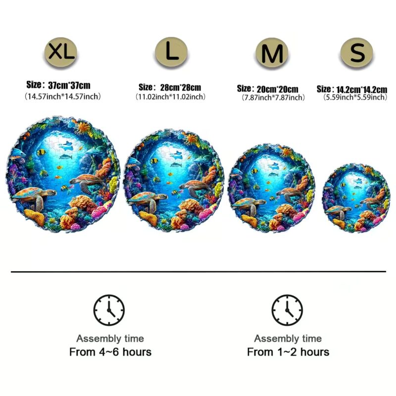 Уникатна дрвена сложувалка- подводен свет, каде секое парче има своја форма- морски животни, растенија и симболи кои ја раскажуваат приказната на сликата. Составувањето е двојна игра: ги барате и формите и сликата. Дел од дрвените сложувалки и сложувалки со животни.
